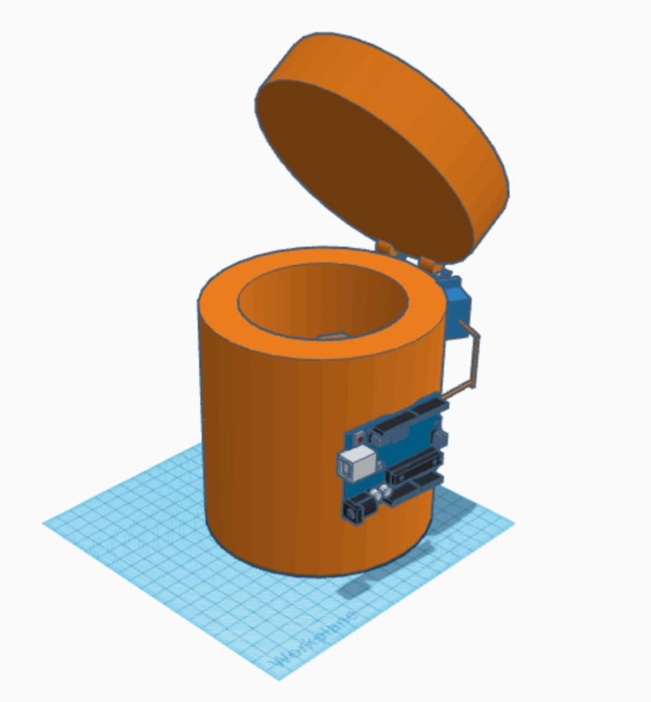 I also progressed on my 3d model by finding a trashcan model online and attaching my circuit to it.